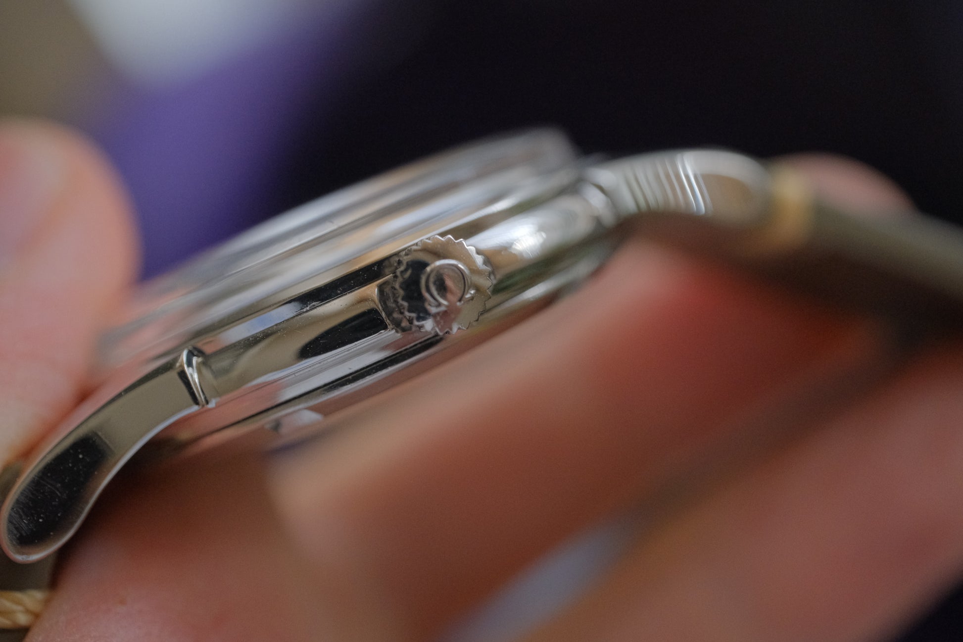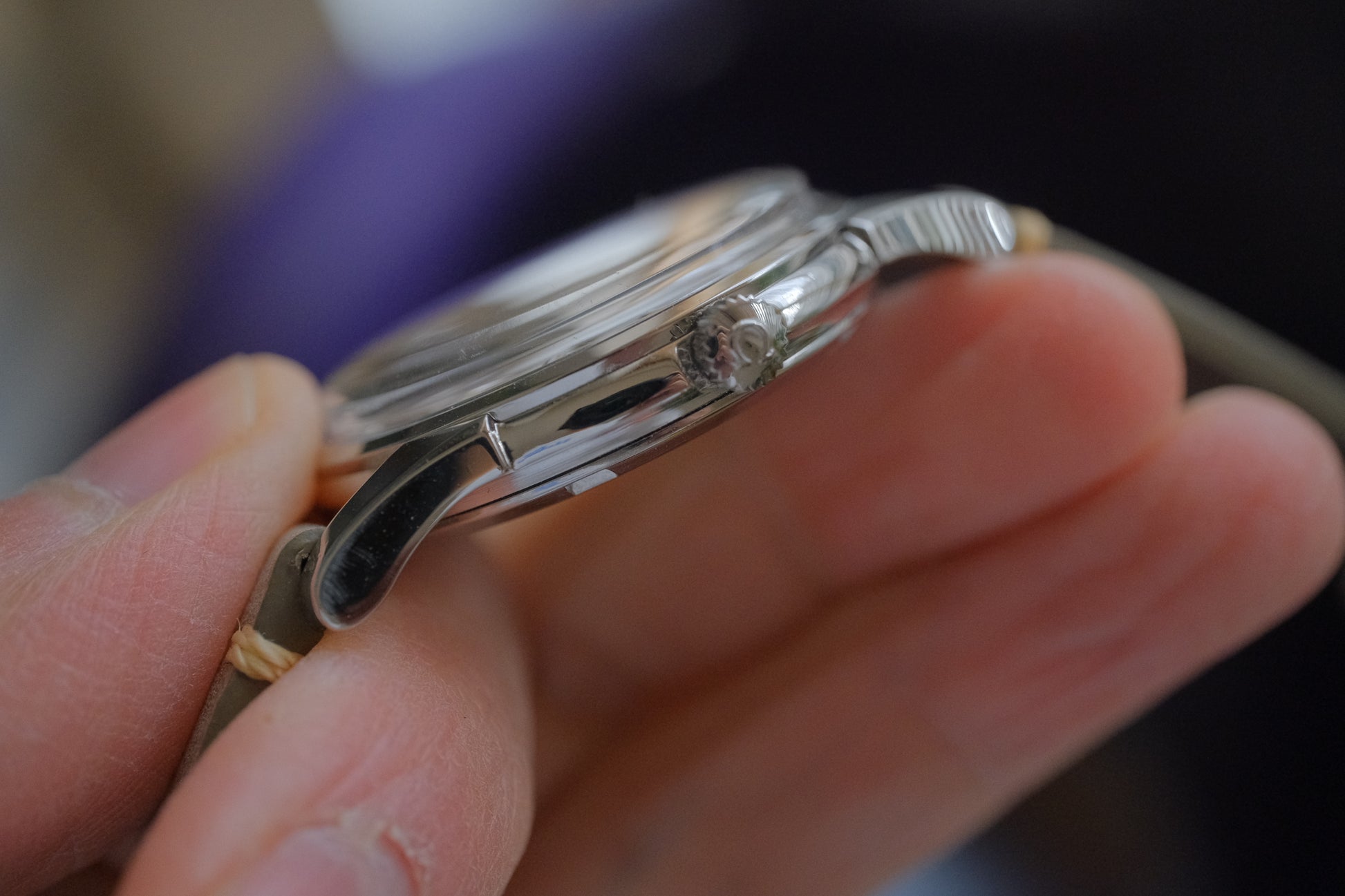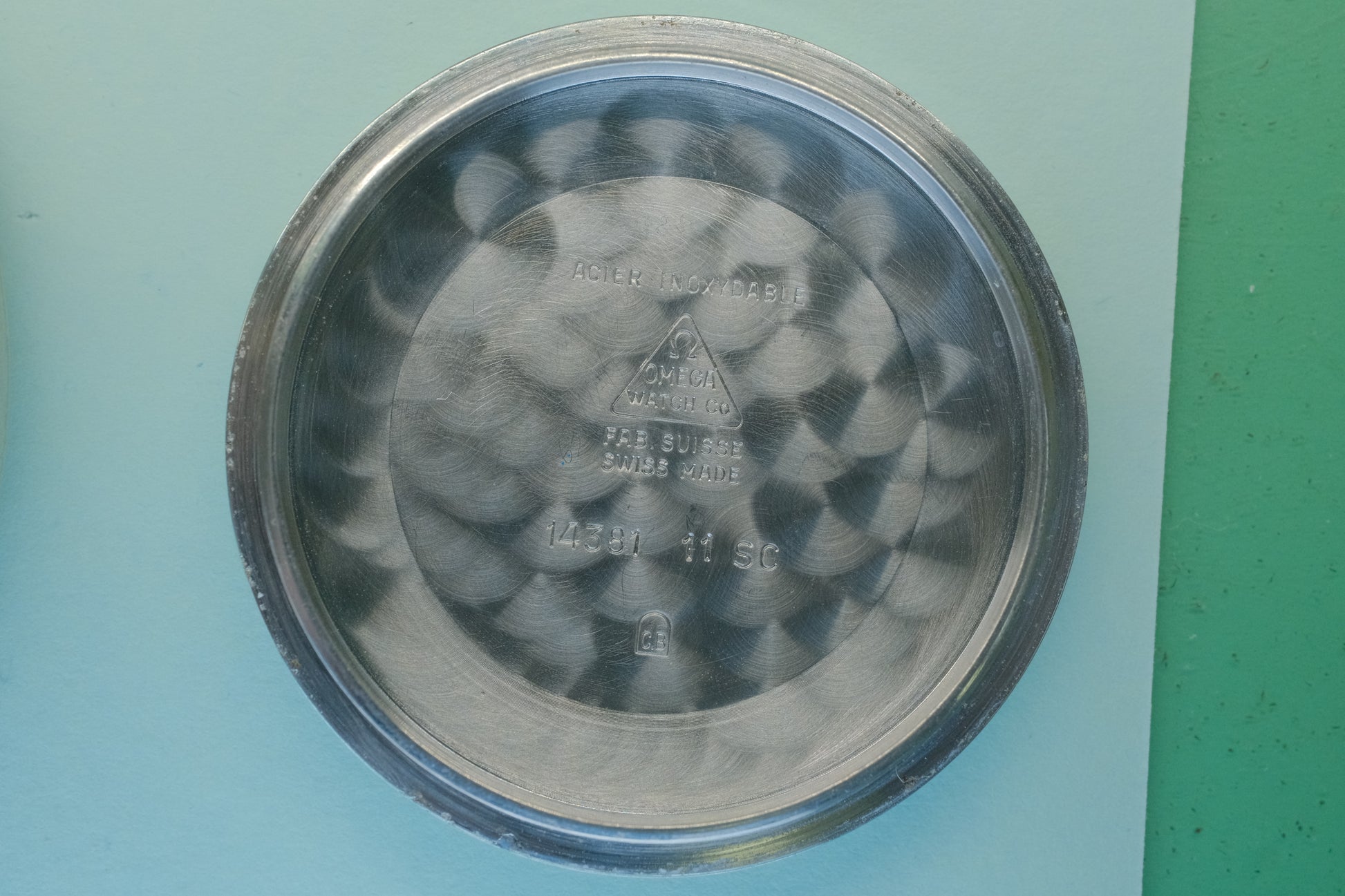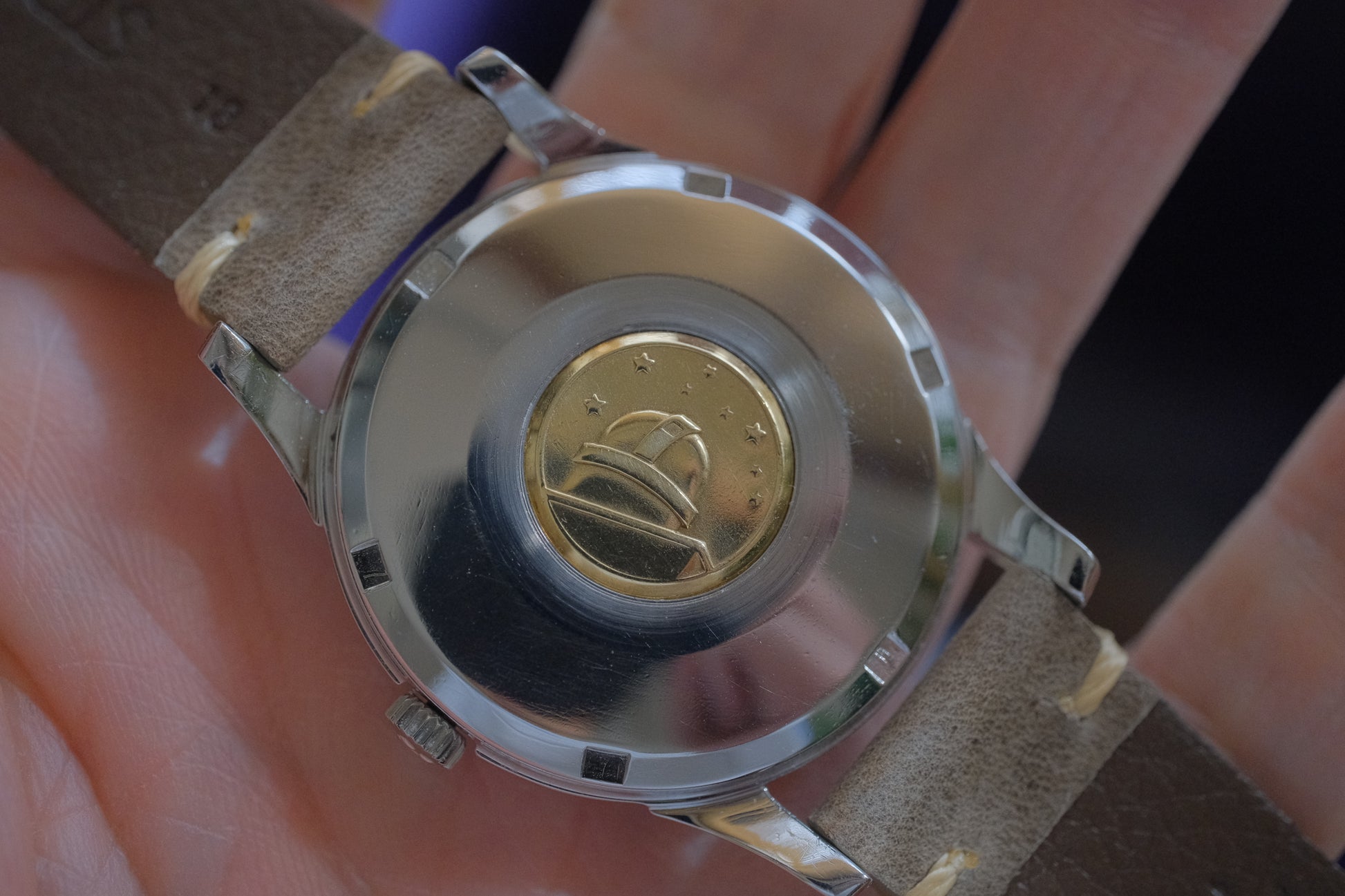 ケース幅34mmは過度なポリッシュ感はなく良いと思います。裏蓋メダリオンの天文台レリーフも摩耗が少なく、良好な状態です。